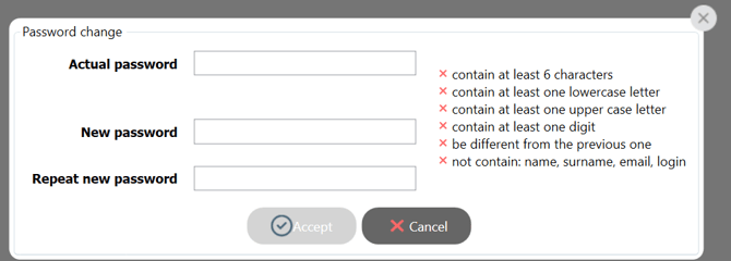 Step 2. A password change window will appear. Enter: your current password, a new password that meets all requirements displayed on the screen (e.g., minimum 6 characters, at least one lowercase letter, etc.), the new password again for confirmation. Click "Accept" - your password will be updated.