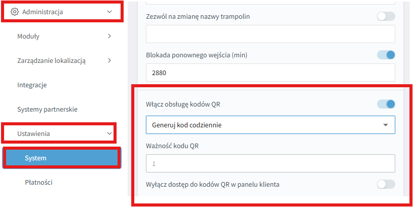W Panelu Menedżera przejdź kolejno do: "Administracja" - "Ustawienia" - " System". W kolumnie "Ogólne" przewiń stronę w dół - znajdziesz tam ustawienia dotyczące konfiguracji kodów QR.