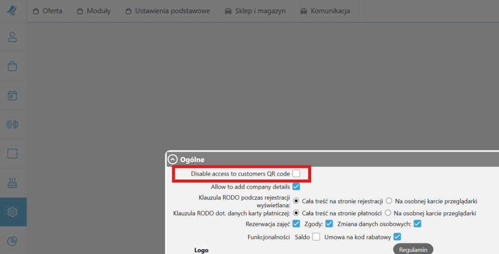 Jeśli klub chce zablokować możliwość generowania kodów QR w Panelu Klienta i pozostawić tę funkcję wyłącznie w aplikacji mobilnej, należy włączyć opcję "Wyłącz dostęp do kodów QR w Panelu Klienta" w konfiguracji.