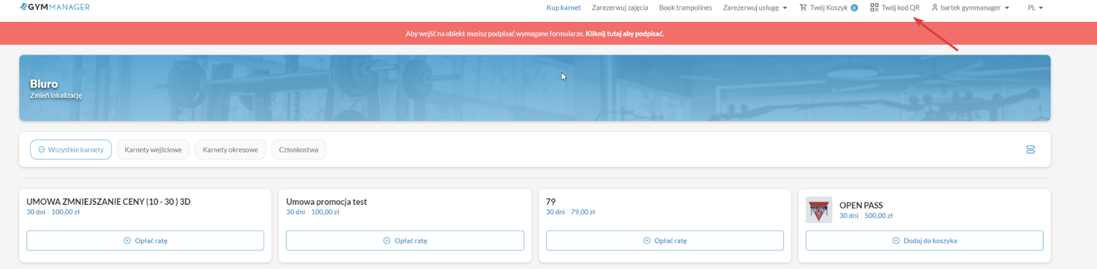 Krok 1. Klient loguje się do Panelu Klienta lub aplikacji mobilnej i przechodzi do zakładki "Twój kod QR".
