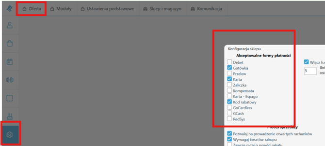 "Administracja"→ "Oferta" → "Ustawienia"i włącz odpowiednie formy płatności.